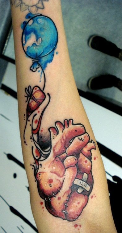 Un corazón lleno de costuras y heridas de múltiple consideración, creado por el artista Loxiput del estudio francés Blacksheep Tattoo. Heridas, que hacen referencia a lo mal que lo ha pasado en el amor su dueña a lo largo de su vida, con las que esta mujer quiere recordarse, que a pesar de los malos momentos, siempre acaba saliendo el sol.