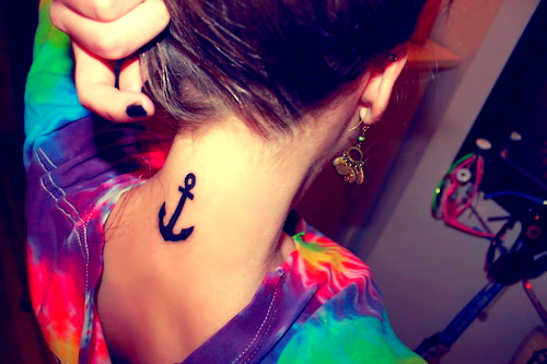 Tatuaje de un ancla en la nuca de una joven, un diseño pequeño y discreto.