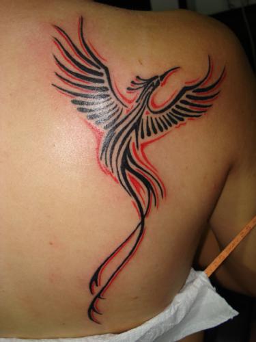 Una chica nos muestra su tatuaje del ave fénix hecho en tintas rojas y negra, el estilo es semejante al de un tribal aunque emplea lineas más curvadas y delgadas.