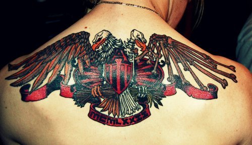 Tatuaje de un aguila en la espalda abril 10, 2012junio 10, 2018 admin Tatuaje de una aguila de dos cabezas en la espalda de un hombre. La mitad del aguila se encuentra muerta mientras sujeta un emblema.
