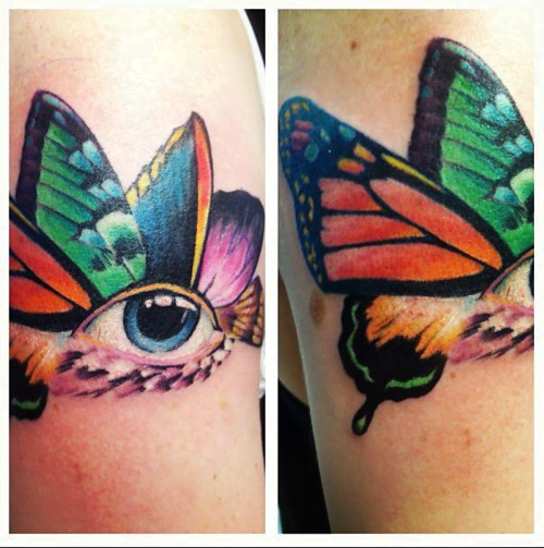 Tatuaje de un ojo cuyas pestañas son las alas de una mariposa. Un tatuaje con colores intensos y un diseño bastante creativo. Realizado Anson Eastin en el estudio Forever Tattoo de la ciudad Cape Coral, Fl. Una tienda que se especializa en los tatuajes tradicionales y que recomiendo mucho que visiten.