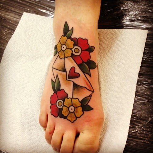 Un sobre acompañado de flores y señado con un corazón. Un tatuaje estilo clásico en el pie.