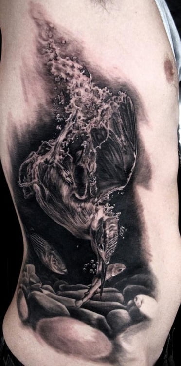 Un tatuaje impresionante en el abdomen de un hombre. Es un tatuaje increíblemente detallado.