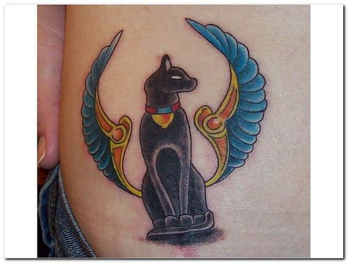 Tatuaje de un gato egipcio. Los asistentes para pasar a la otra vida según la mitología egipcia, de allí que sea un símbolo tan frecuente y sagrado.