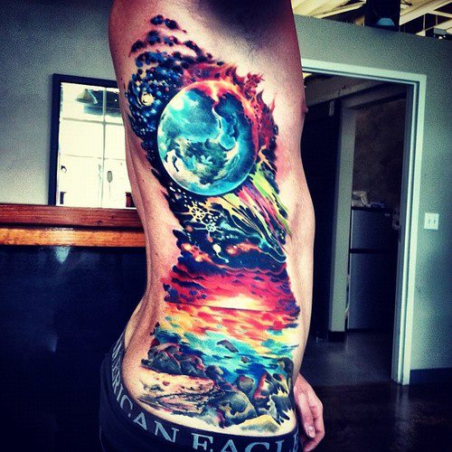 Tatuaje en el costado y parte del pecho, un paisaje de una costa con colores que suben hasta fusionarse con el espacio.