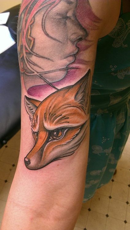 Un par de tatuajes en el antebrazo de una mujer. Primero se ve el retrato de una mujer con un estilo de caricatura, y debajo (que es el que me ha llamado la atención) se ve el dibujo de un zorro.